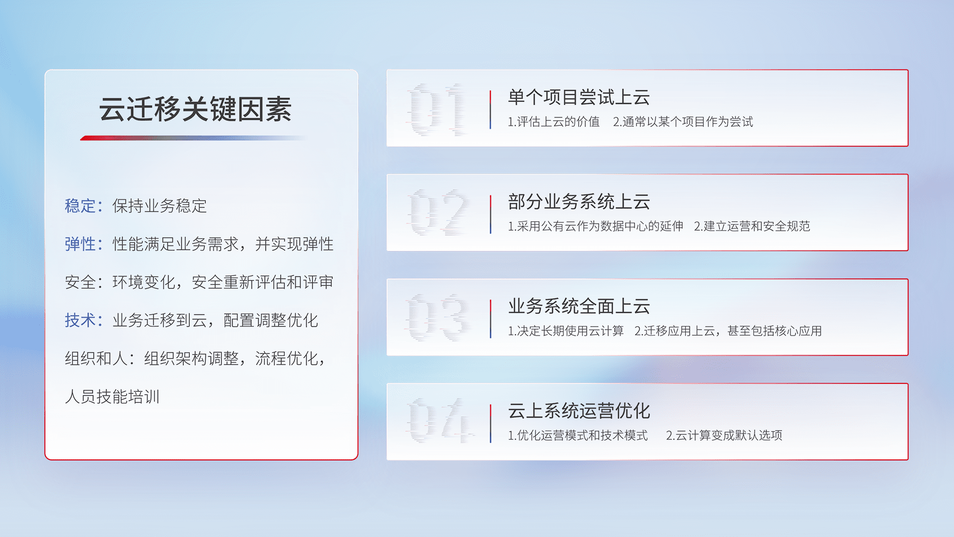 结合实际业务,,,从规划设计、、、、云平台选型、、、、云原生改造、、、数据迁移、、、集成交付,,,,迁移全过程为客户识别最佳上云路径,,做好风险识别管理,,,,设计网络架构、、身份权限、、、、安全审计合规、、操作审计、、、、日志审计、、、、监控告警策略、、、、多站点容灾设计等,,,,对云上基础设施进行整体规划,,,,提升IT治理水平,,以满足弹性、、、、高可用、、高性能的需求。。