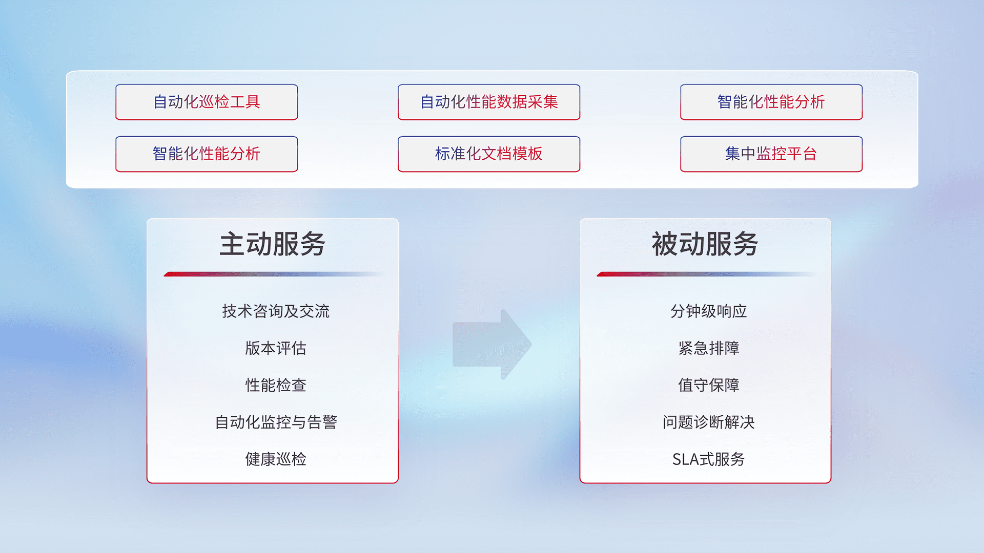 智能化工具和标准化文档,,保障服务质量,,,,提供主动服务(包含技术咨询、、、、版本评估、、、、性能检查、、、、自动化监控与告警、、健康巡检)和被动服务包含(分钟级响应、、紧急排障、、、值守保障、、问题诊断解决、、、SLA服务)。。。。